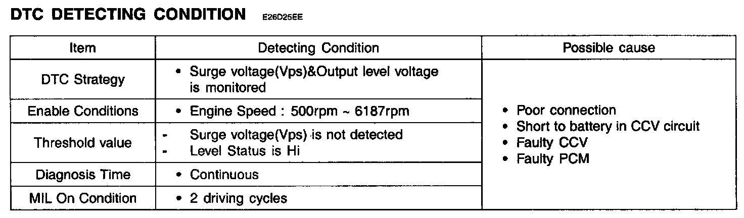 If the surge & output voltage is satisfied with threshold value, the PCM determines that a fault exists and a DTC is stored.
