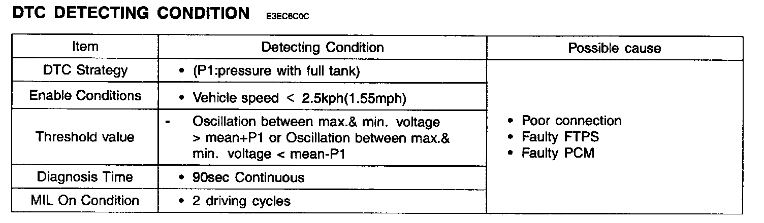 If the oscillation of fuel tank pressure's signal is out of the threshold value, the PCM determines that a fault exists and a DTC is stored.