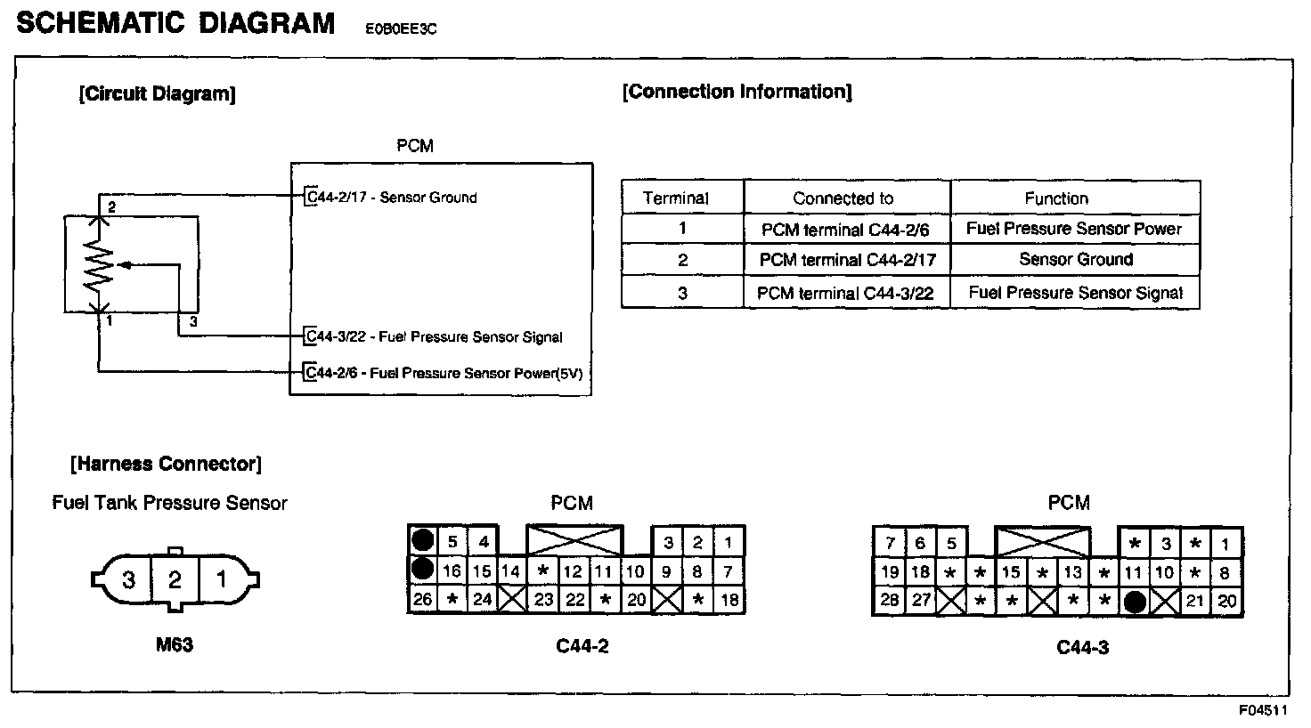 The evaporative emission control system prevents hydrocarbon vapors from escaping from the fuel tank into the atmosphere where they could form photochemical smog. Gasoline vapors are collected in the charcoal canister. The Fuel Tank Pressure Sensor (FTPS) is an integral part of the evaporative monitoring system. The PCM monitors the FTPS signal to detect vacuum decay and excess vacuum. The FTPS measures the difference between the air pressure inside the fuel tank and outside air pressure to check the purge control solenoid valve operation and for leak detection in the evaporative emission control system by monitoring pressure and vacuum levels in the fuel tank during the purge control solenoid valve operating cycles.