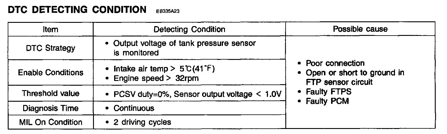If the sensor output voltage is less than 1.0 V with PCSV duty=0%, the PCM determines that a fault exists and a DTC is stored.