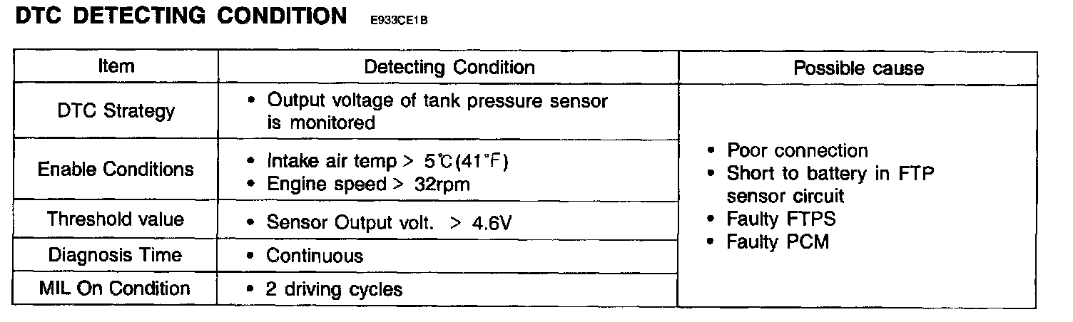 If the sensor output voltage is higher than 4.6 V, the PCM determines that a fault exists and a DTC is stored.