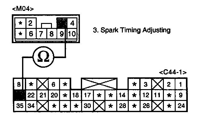 The PCM computes ignition timing in response to the signals from several sensors. The timing is fixed during the start-up phase. However, when the engine has been started and the vehicle is driven away, the ECM computes the optimum timing based on the engine speed, load and temperature. The ignition timing is fixed BTDC 5 and DTC P1330 is set when connecting Ignition control terminal of Multipurpose Check Connector and ground. If disconnect Ignition control terminal of Multipurpose Check Connector and ground, the DTC is erased automatically. Make sure to check for short circuit to ground between Ignition control terminal of Multipurpose Check Connector and chassis ground when DTC is set.