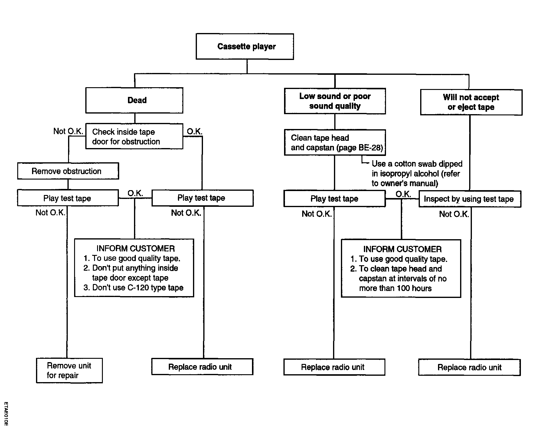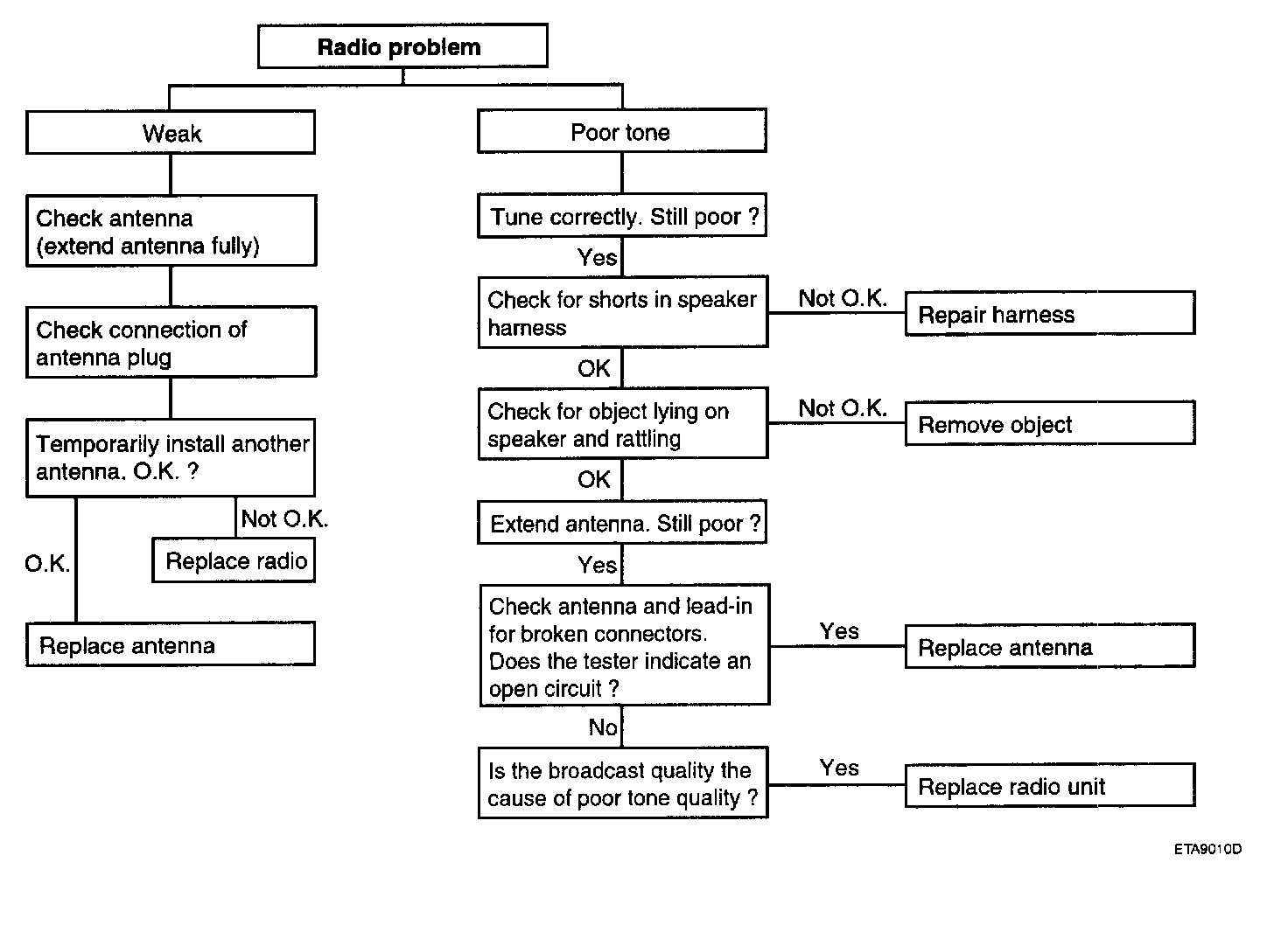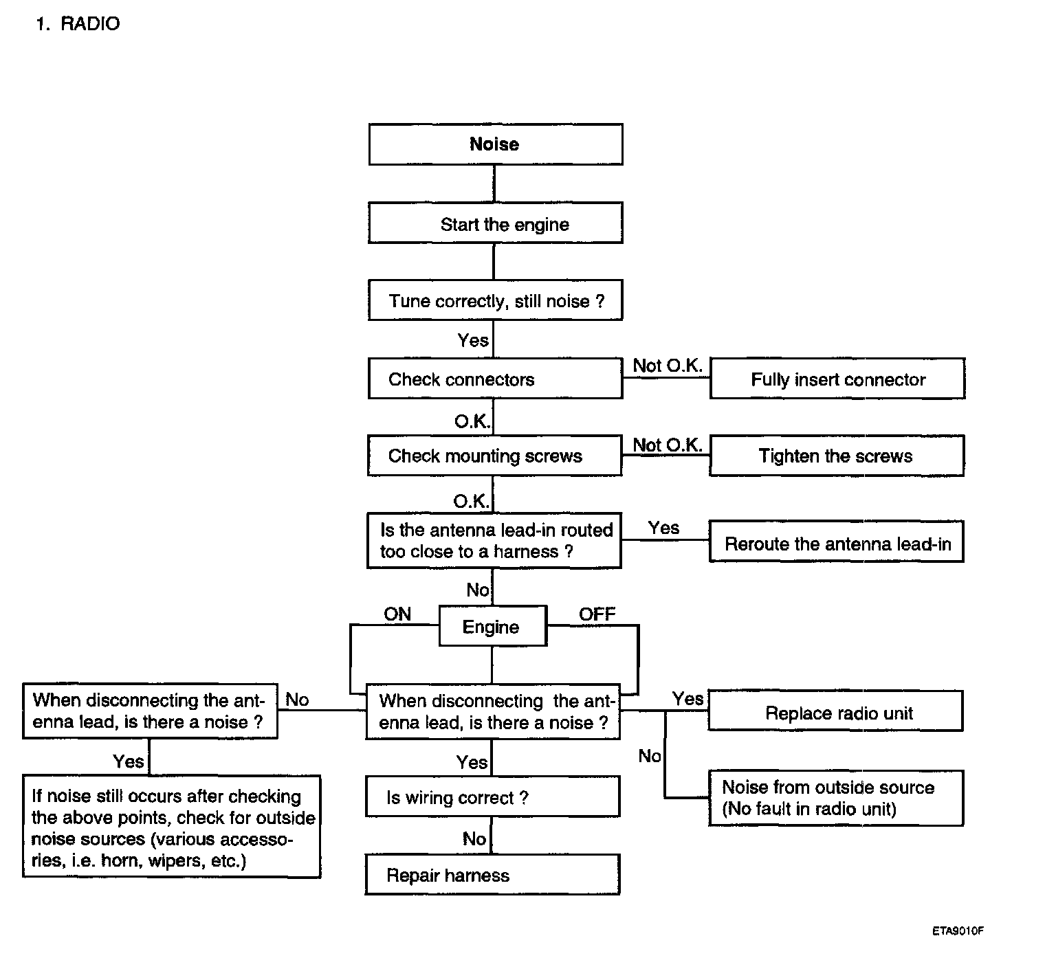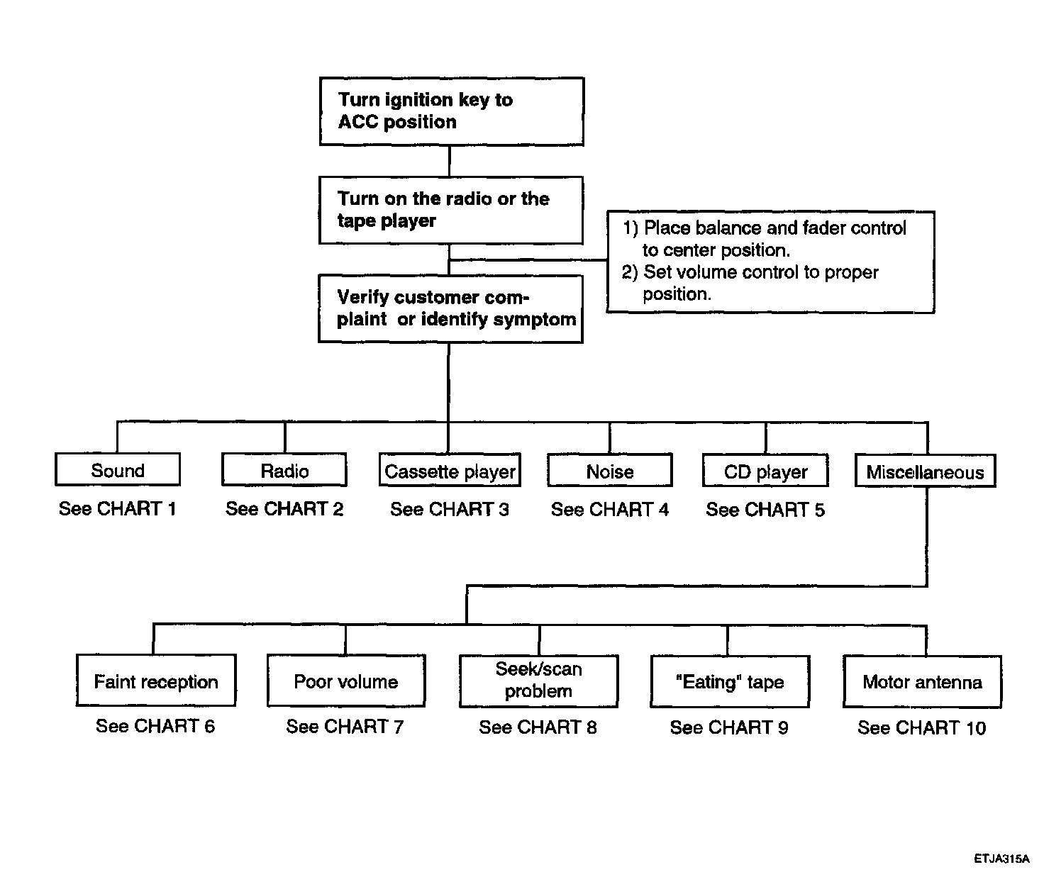AUDIOThere are six areas where a problem can occur: wiring harness, the radio, the cassette tape deck, the CD player, the speaker, and antenna.Troubleshooting enables you to confine the problem to a particular area.