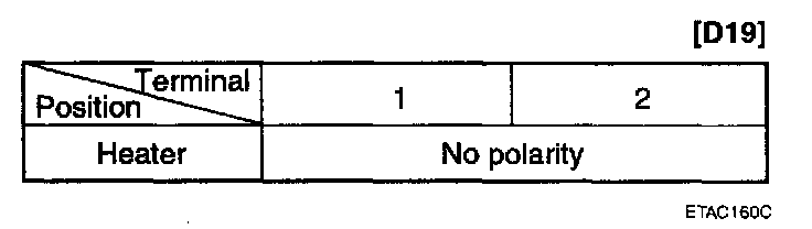 2. Apply battery voltage to each terminal as shown in the table and verify that the mirror operates properly.
