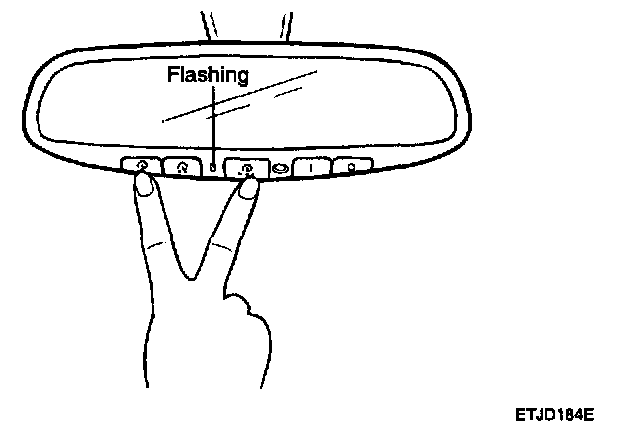 1. When programming the buttons for the first time, press and hold the two outside HomeLink buttons (1), (2) releasing when the indicator light begins to flash (approximately 20 seconds). This procedure erases the factory-set default codes. Do not perform this step when programming additional transmitters.