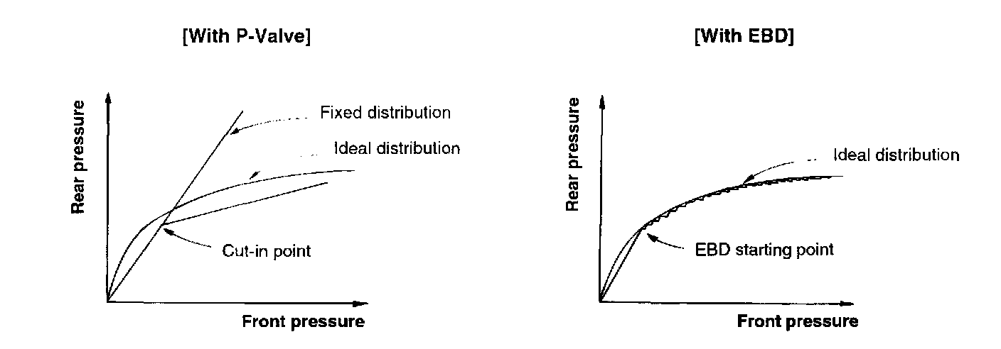 EBD controlled by the ABS Control Module, calculates the slip ratio of each wheel at all times and controls the brake pressure of the rear wheels not to exceed that of the front wheels.