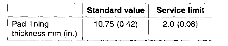 2. Check the pad thickness through the cylinder inspection hole. If the pad lining thickness is out of specification, replace the pads.