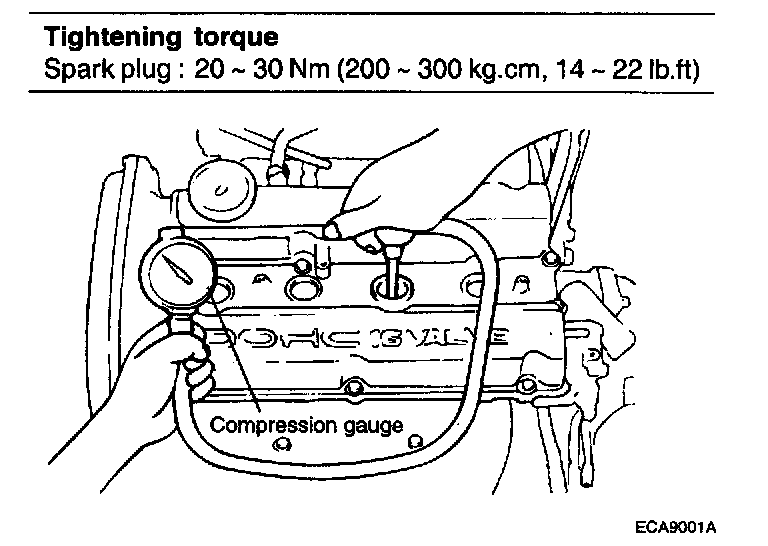 CHECKING COMPRESSION PRESSURE1. Before checking engine compression, check the engine oil level. Also check that the starter motor and battery are all in normal operating condition.
