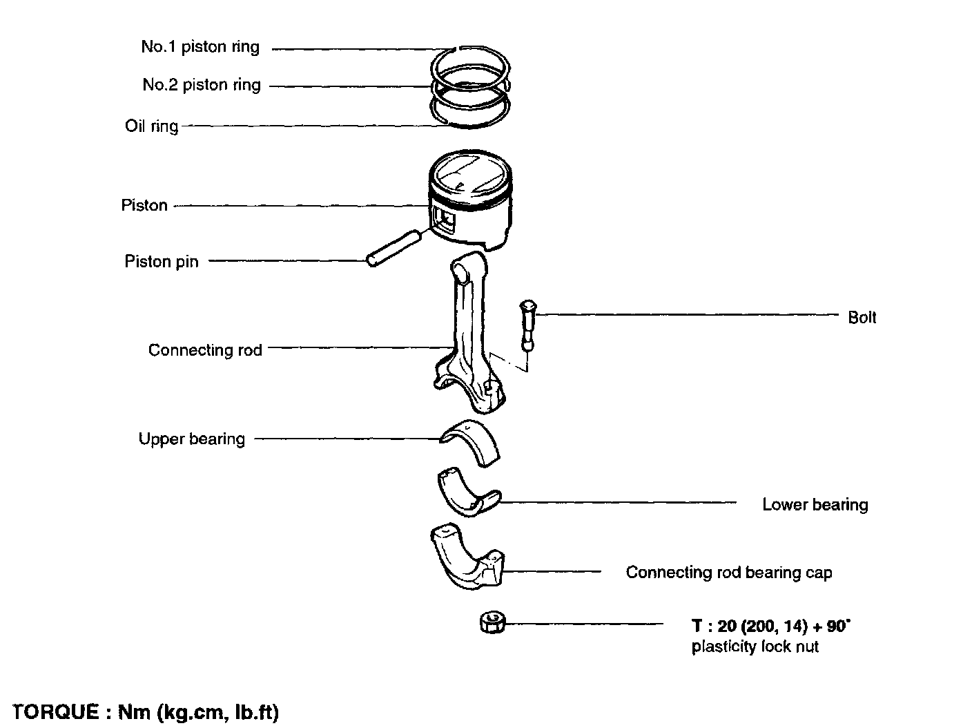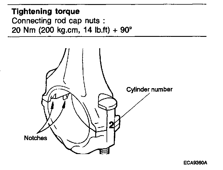Connecting rod cap nuts: 20 Nm (200 kg-cm, 14 ft. lbs.) + 90°