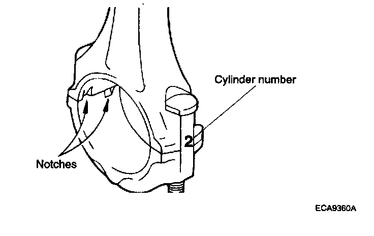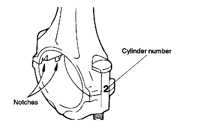 1. When the connecting rod cap is installed, make sure that cylinder numbers, marked on the rod end cap at disassembly, match. When a new connecting rod is installed, make sure that the notches for holding the bearing in place are on the same side.