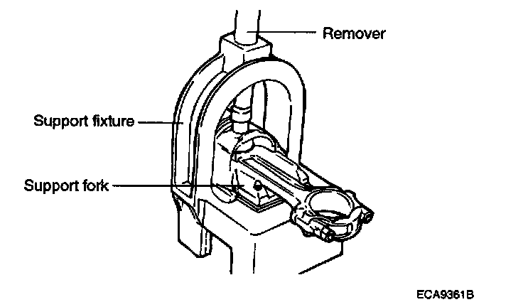 4. To remove the pin from the piston, place the piston in the support fixture while the rod resting on the fork inserts. Pass the remover tool through the top of the support fixture and use it to press out the pin.