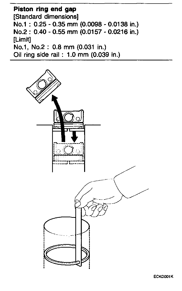 2. To measure the piston ring end gap, insert a piston ring into the cylinder bore. Position the ring at right angles to the cylinder wall by gently pressing it down with a piston. Measure the gap with a feeler gauge. If the gap exceeds the service limit, replace the piston ring.