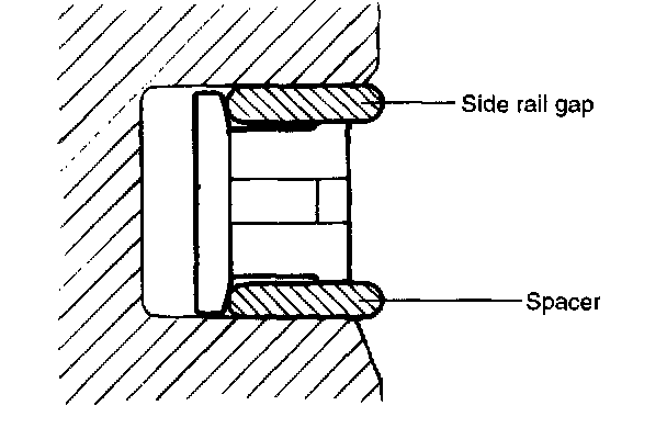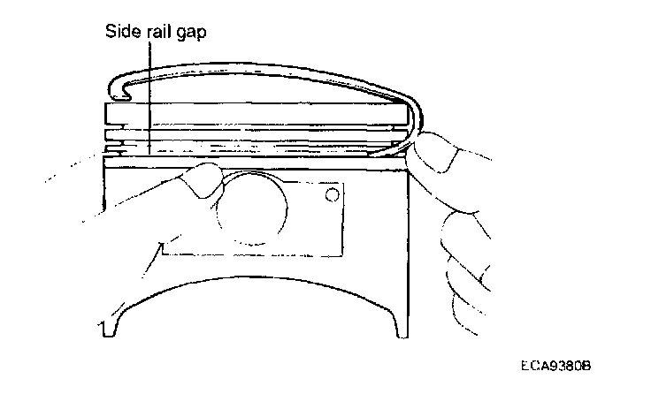 2. Install the upper side rail. To install the side rail, first put one end of the side rail between the piston ring groove and spacer, hold it firmly, then press down with your finger the portion to be inserted into groove as illustrated.