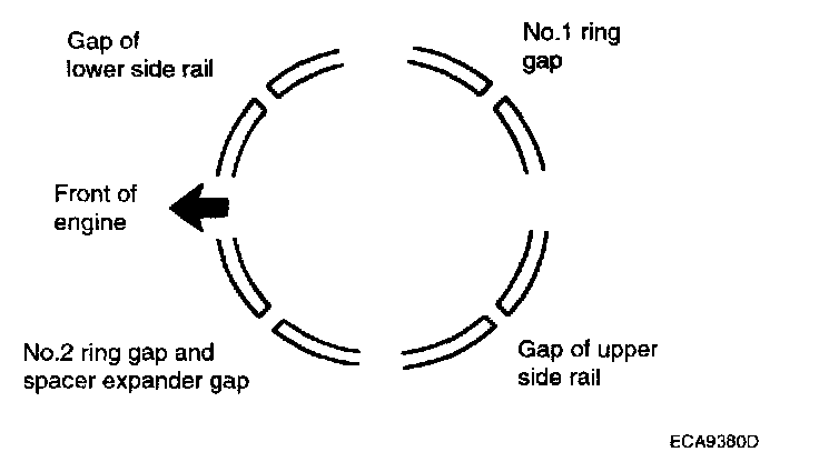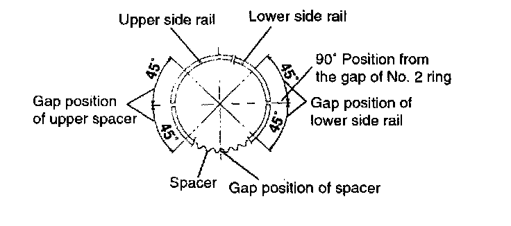 7. Place each piston ring end gap as far apart from its neighboring gaps as possible. Make sure that gaps are not positioned in the thrust and pin directions.