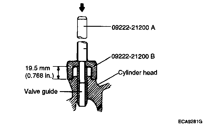 3. Using the special tool (09222-21200 A, B), press-fit the valve guide. The valve guide must be press-fitted from the upper side of the cylinder head. Keep in mind that the intake and exhaust valve guides are different in length.