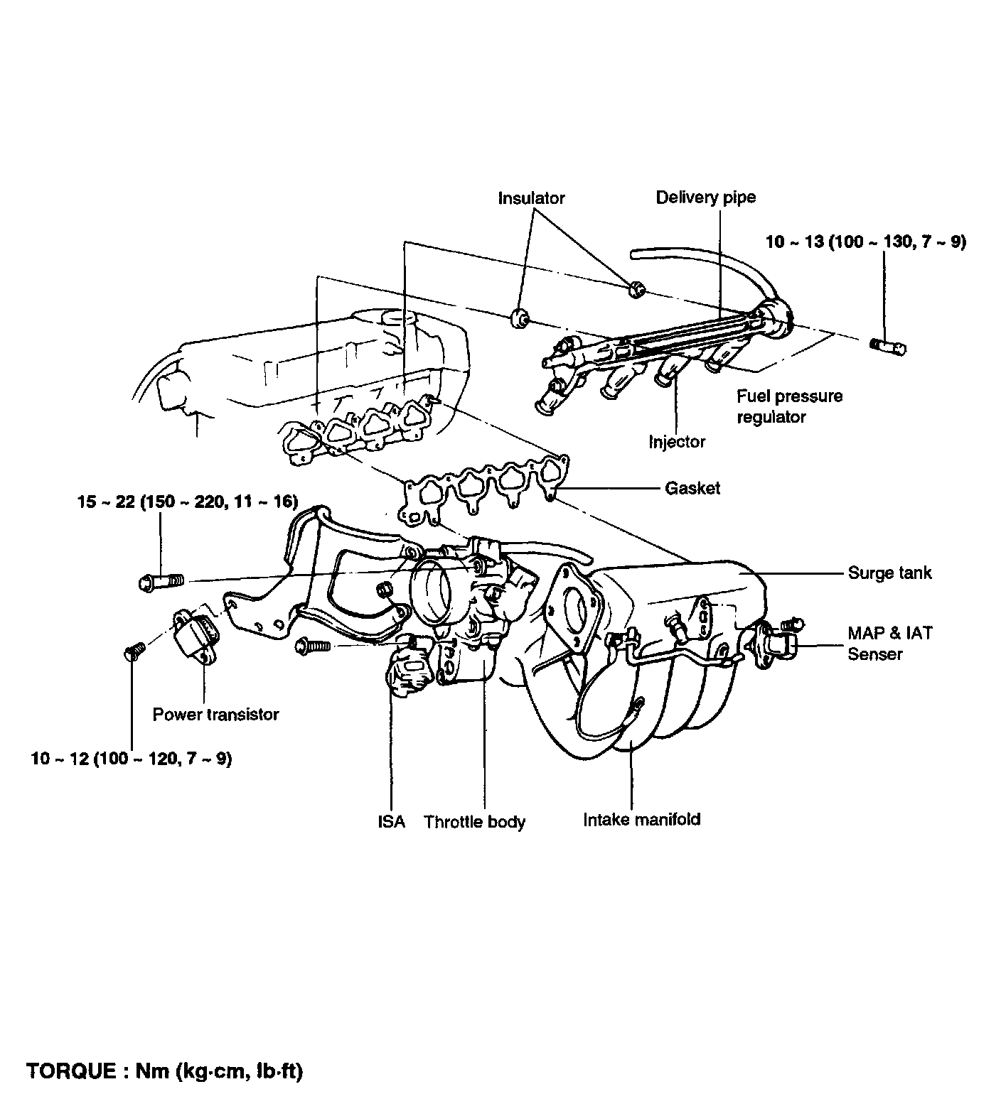 Intake manifold stay and cylinder block: 18 - 25 Nm (180 - 250 kg-cm, 13 - 18 ft. lbs.)