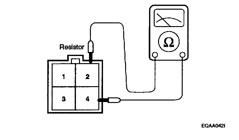 Measure terminal-to-terminal resistance of the blower resistor. If measured resistance is not within specification, the blower resistor must be replaced. (After removing the resistor).