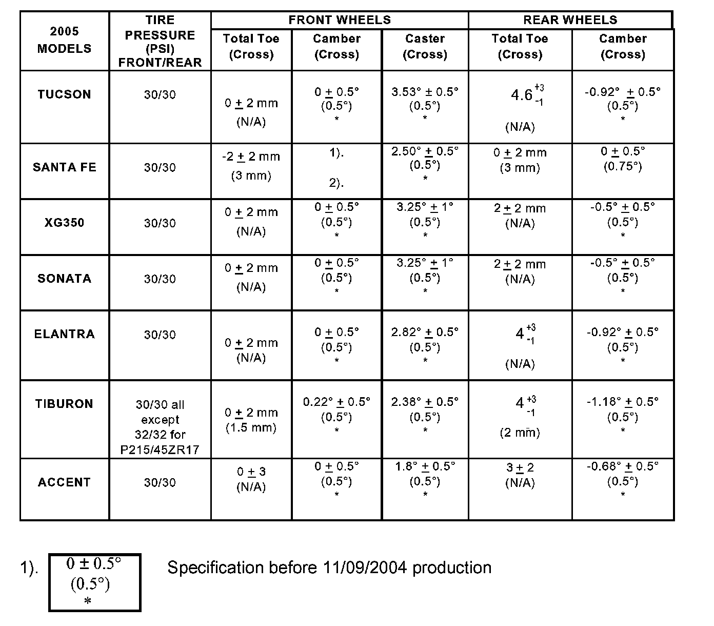 2005 MODEL YEAR ALIGNMENT SPECIFICATIONS CHART: