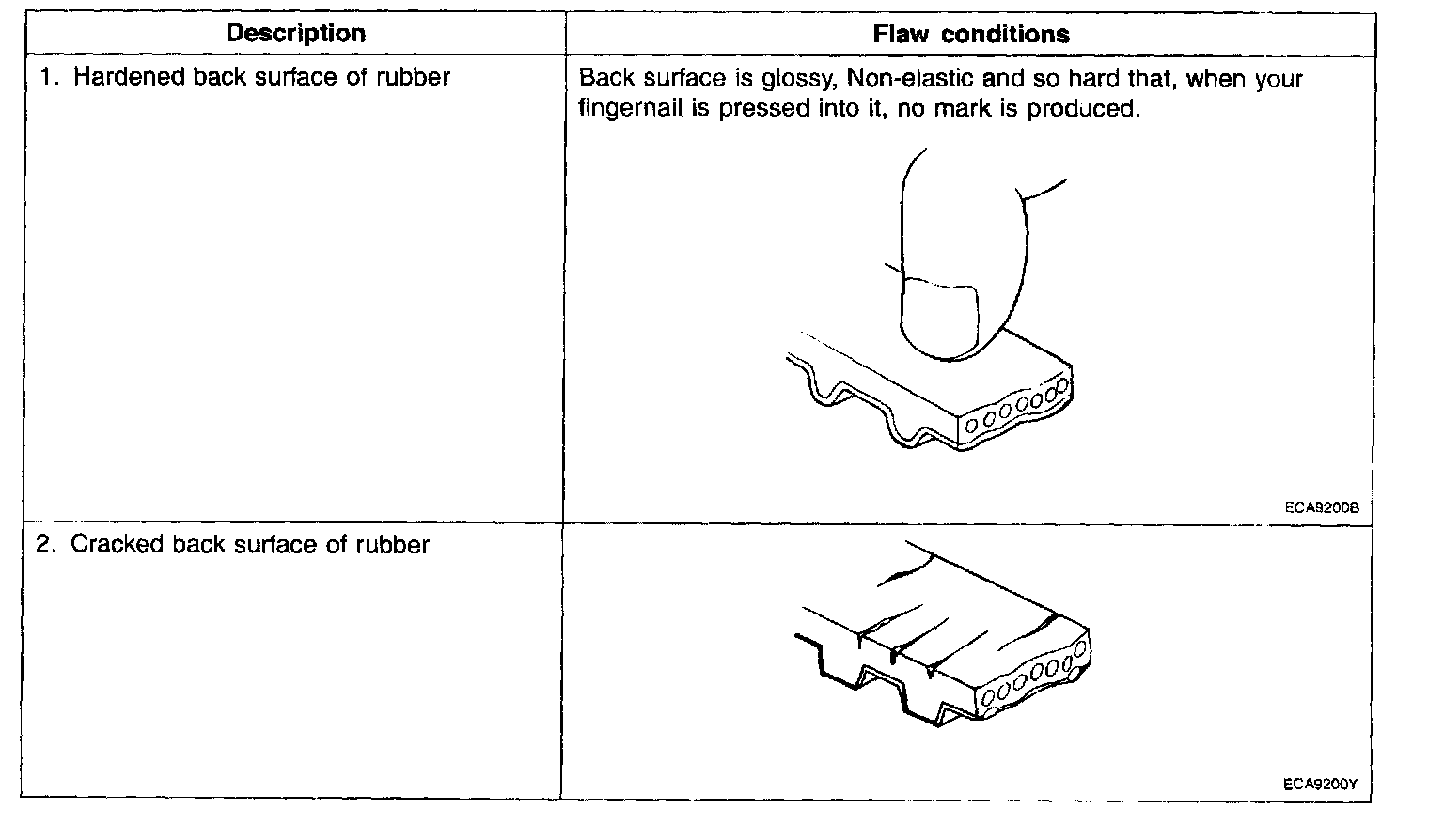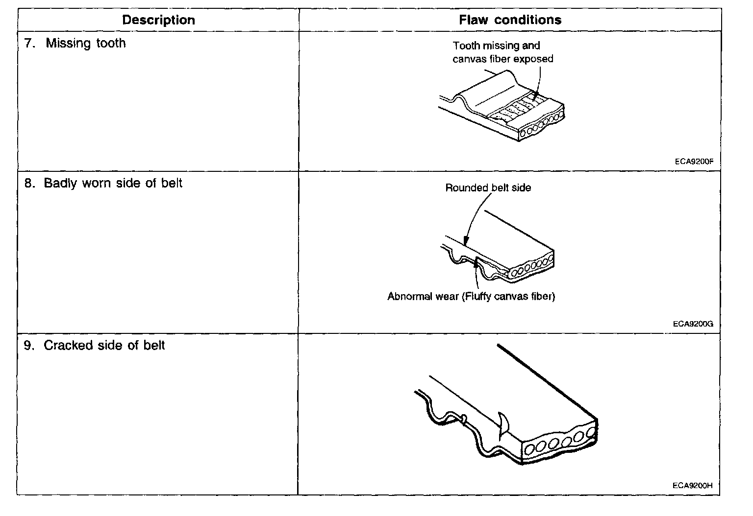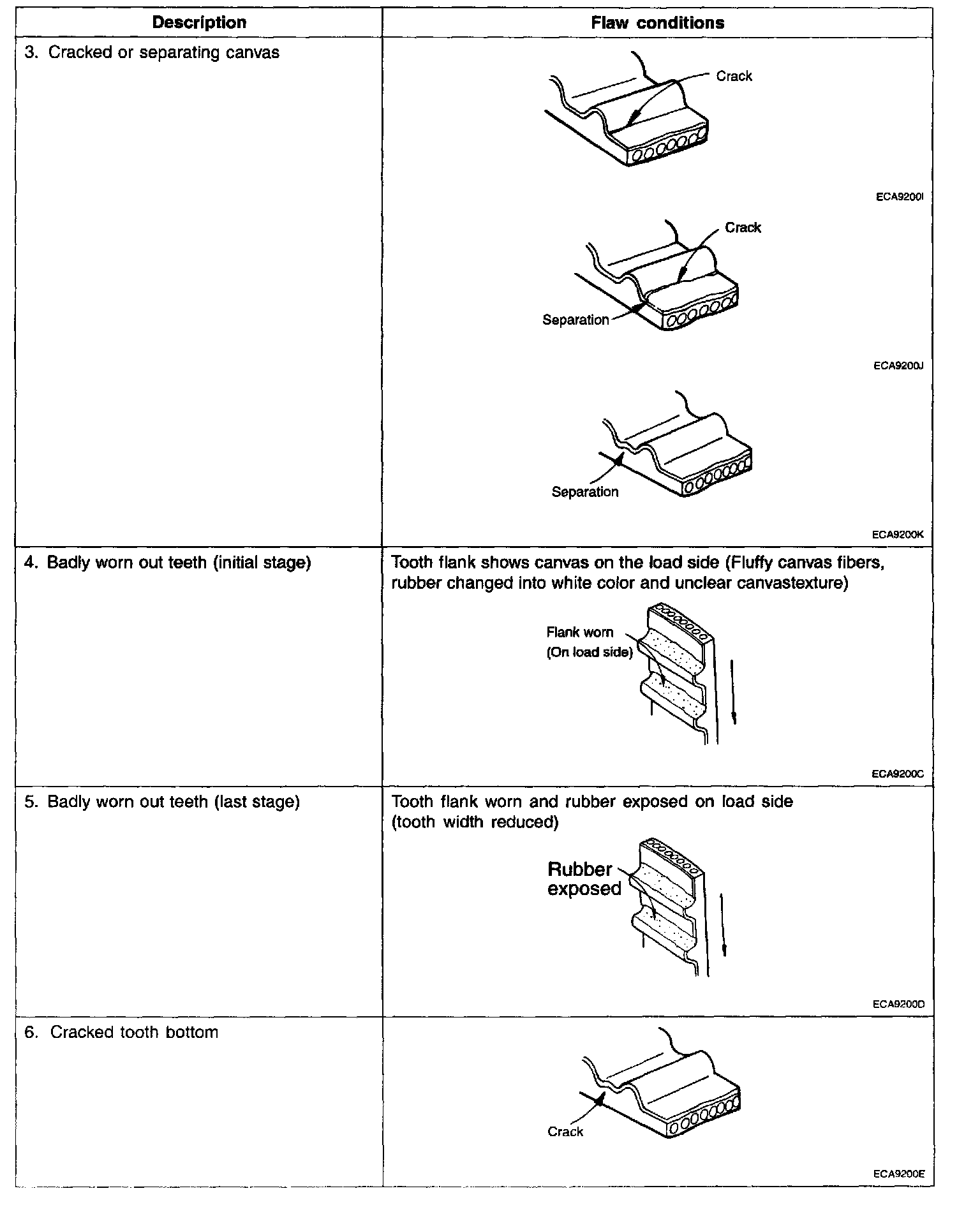 2. When the engine is overhauled or belt tension is adjusted, check the belt carefully. If any of the following flaws are evident, replace the belt with a new one.