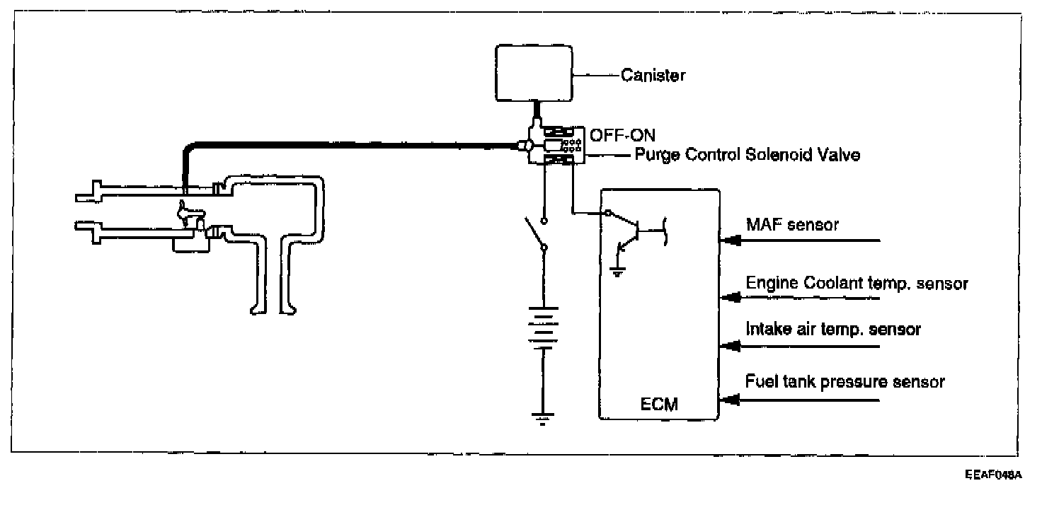 Evaporative (EVAP) Canister Purge Solenoid ValveThe Purge Control Solenoid Valve is controlled by the ECU; when the engine coolant temperature is low, and also during idling, the valve closes so that evaporated fuel is not drawn into the surge tank. After engine warm-up during ordinary driving, it opens to let the stored vapors flow into the surge tank.