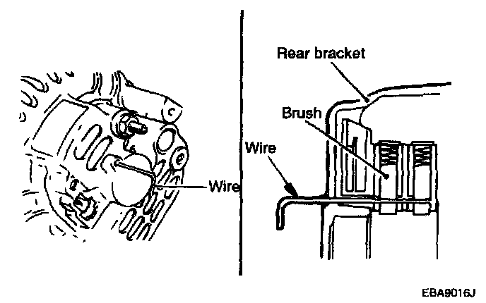 Before the rotor is attached to the rear bracket, insert a wire through the small hole in the rear bracket to lock the brush. After the rotor has been installed, the wire can be removed