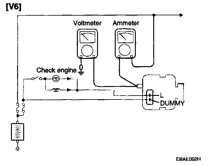 1. Check to see that the voltmeter reads as the same value as the battery voltage. If the voltmeter reads 0 V, and the open circuit in the wire between the generator "B" terminal and battery (-) terminal, a blown fusible link or poor grounding is suspected.