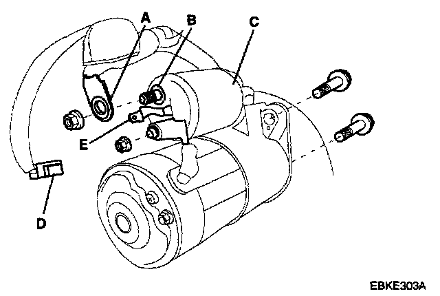 2. Disconnect the starter cable(A) from the B terminal(B) on the solenoid(C), then disconnect the connector(D) from the S terminal(E).