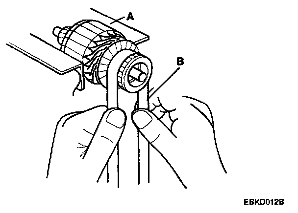 4. Check the commutator (A) surface. If the surface is dirty or burnt, resurface with emery cloth or a lathe within the following specifications, or recondition with #500 or #600 sandpaper (B).