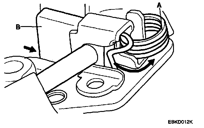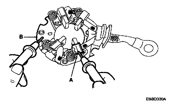 STARTER BRUSH HOLDER TEST1. Check that there is no continuity between the (+) brush holder (A) and (-) brush holder (B). If there is no continuity, replace the brush holder assembly.