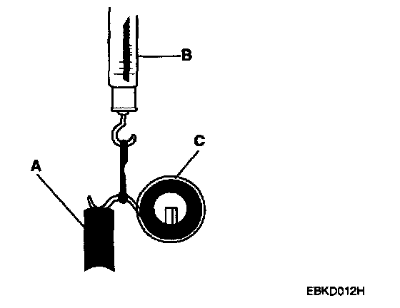 2. Insert the brush (A) into the brush holder, and bring the brush into contact with the commutator, then attach a spring scale (B) to the spring (C). Measure the spring tension at the moment the spring lifts off the brush.