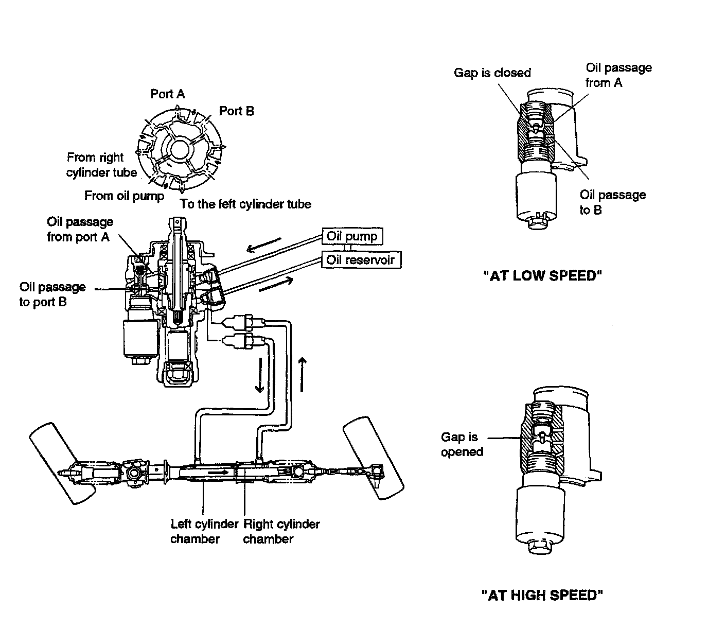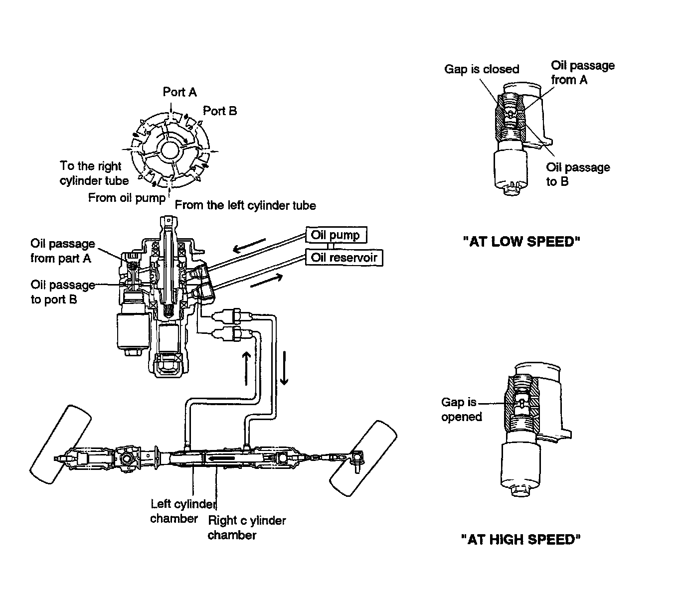 As the vehicle speed decreases, the hole of piston connecting the left chamber and right chamber is gradually closed while the oil pressure produced by oil pump is being transferred to the left chamber. Therefore, the steering effort is reduced.