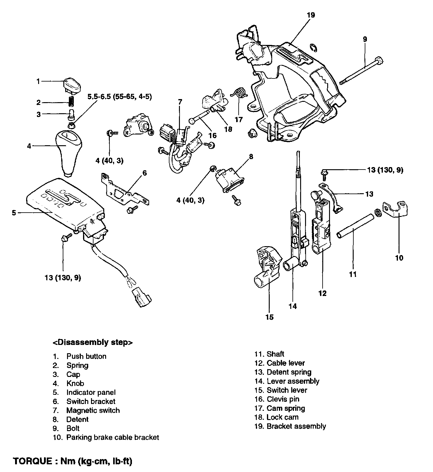 2. When the brake pedal stroke is 15-22mm With shift lever at "P" position), the push button should be operable without catching and the shift lever should shift smoothly to other positions.