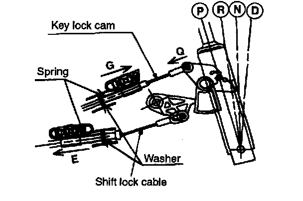 4. Slightly pull the shift lock cable in the direction "E".