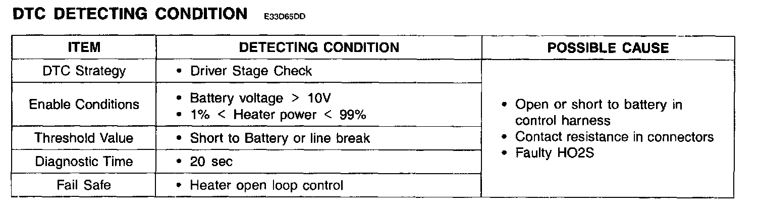 ECM sets DTC P0052 if the ECM detects that the front HO2S heater control line is open or short to battery line.