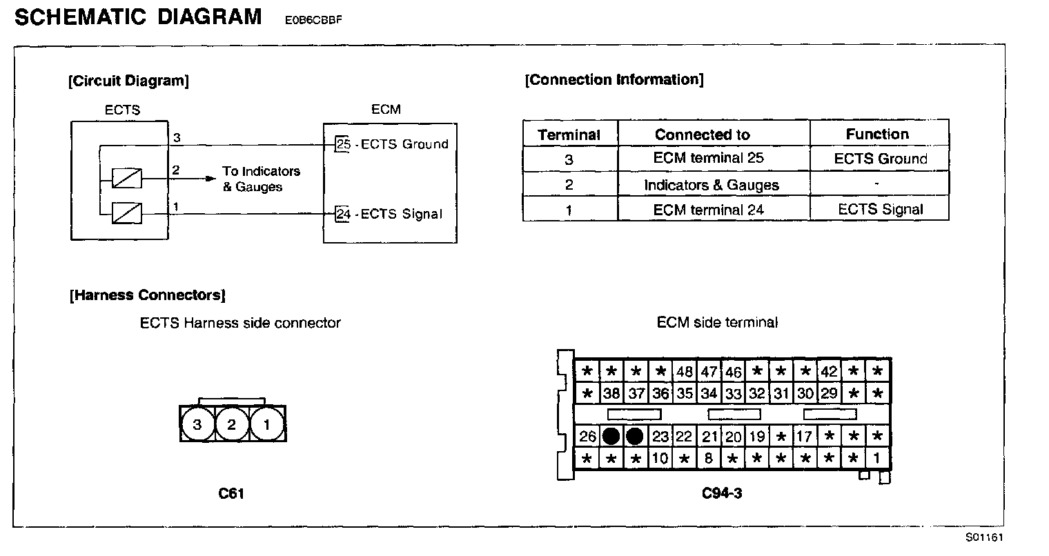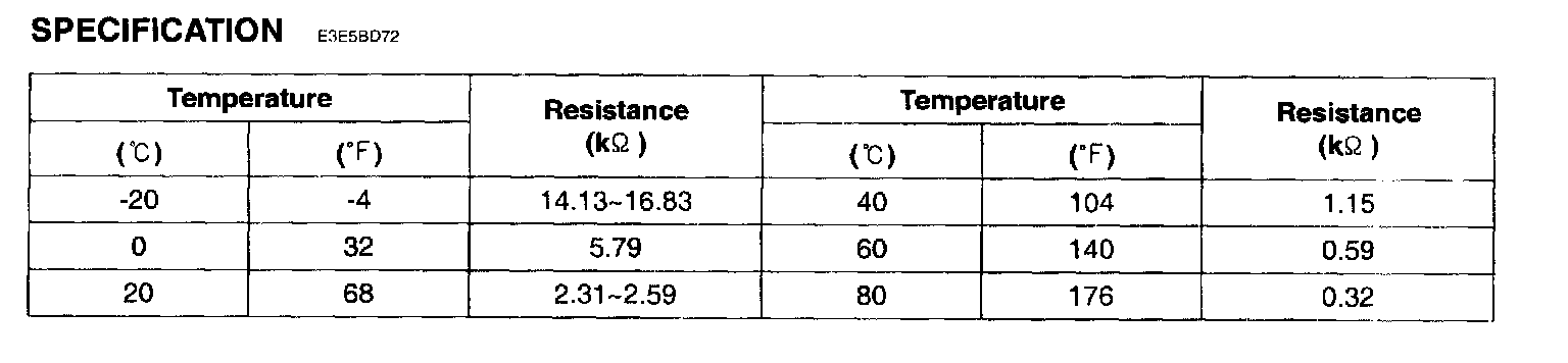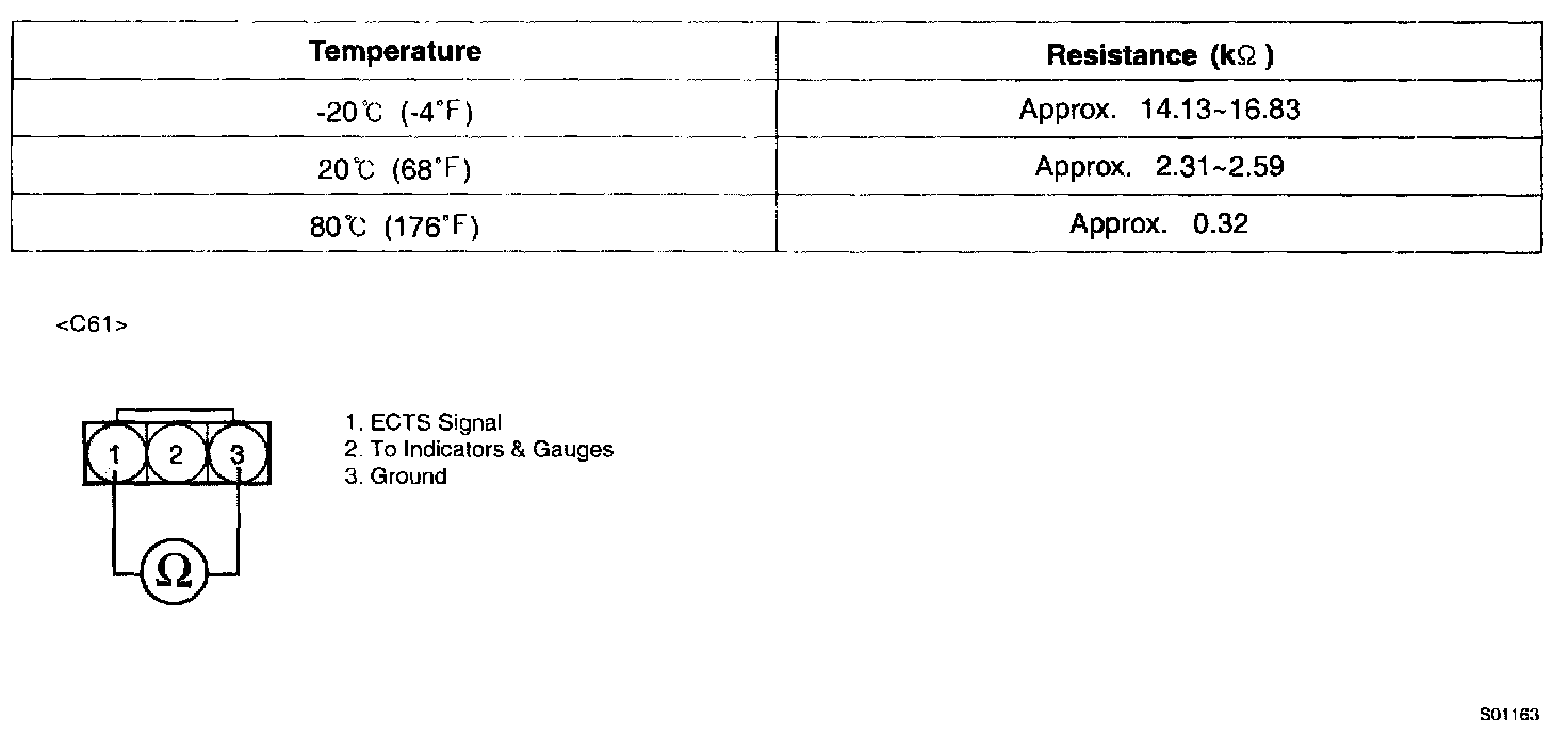 The Engine Coolant Temperature Sensor (ECTS) is located in the engine coolant passage of the cylinder head for detecting the engine coolant temperature. The ECTS uses a thermistor whose resistance changes with the temperature. The electrical resistance of the ECTS decreases as the temperature increases, and increases as the temperature decreases. The reference 5 V in the ECM is supplied to the ECTS via a resistor in the ECM. That is, the resistor in the ECM and the thermistor in the ECTS are connected in series. When the resistance value of the thermistor in the ECTS changes according to the engine coolant temperature, the output voltage also changes.