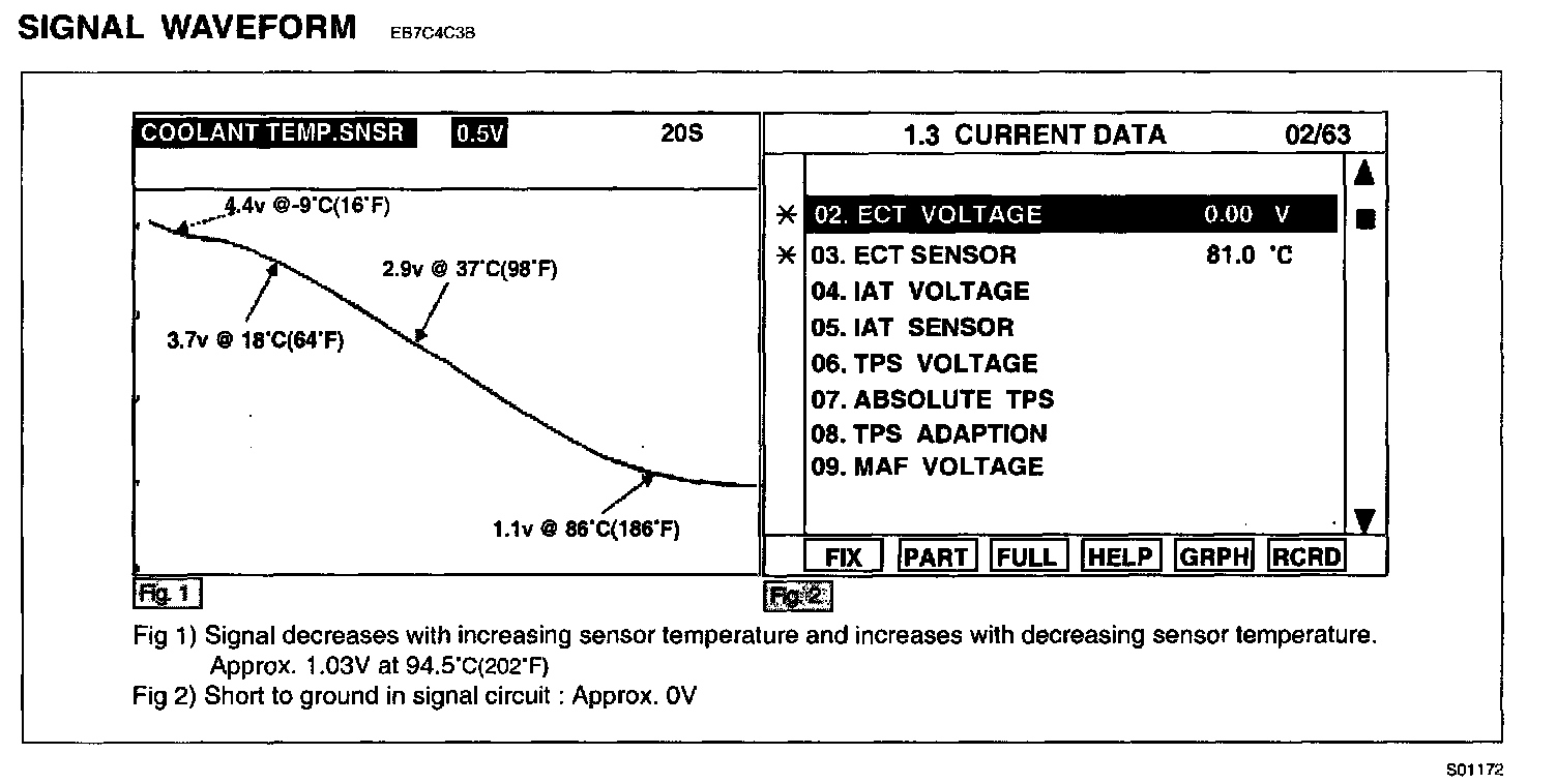 3. Connect Scantool and monitor the "COOLANT TEMP. SNSR(V)" parameter on the Scantool data list.