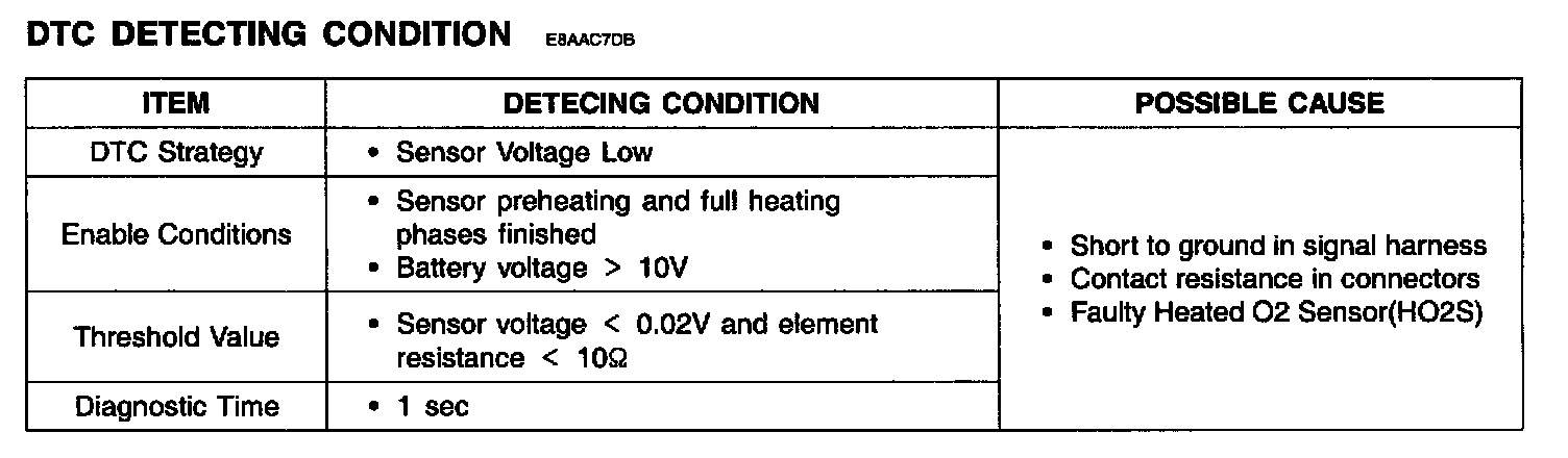 ECM sets DTC P0157 if the ECM detects signal voltage lower than the possible range of a properly operating rear heated oxygen sensor (HO2S).