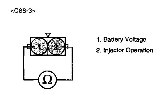3. Measure resistance between terminals 1 and 2 of the injector connector(Component side).