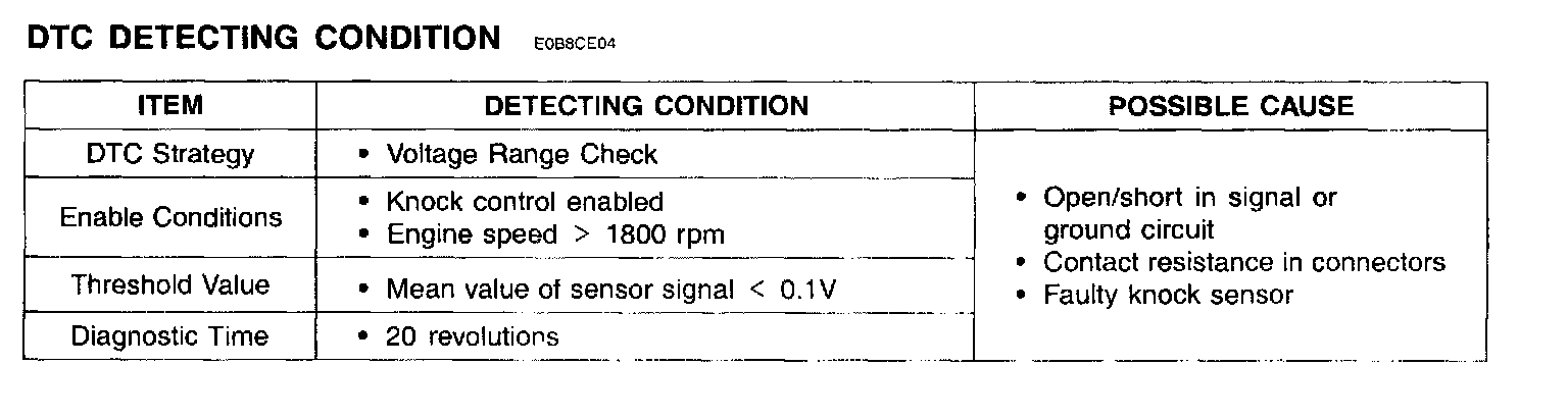 The ECM monitors the range of the analog input signal from knock sensor to check sensor failure that is short circuit or open circuit. If the difference between knock signal and noise level is smaller than the threshold during defined time period, the DTC P0325 is set. In case the noise level is higher than the upper threshold or lower than the lower threshold, the DTC P0325 is set too.