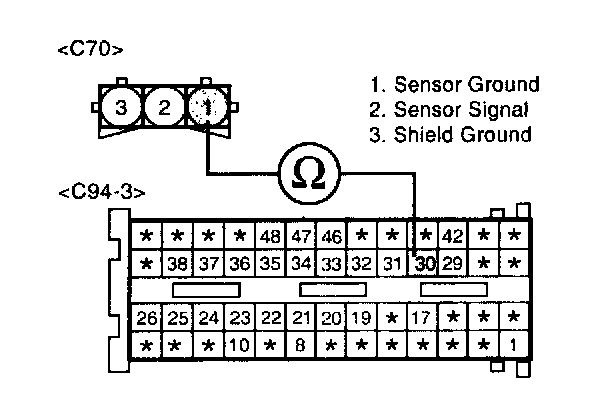 3. Measure resistance between terminals 1 of the sensor harness connector and 30 of the ECM harness connector.