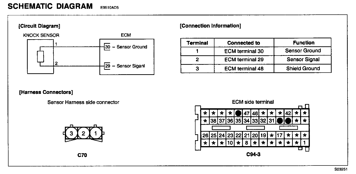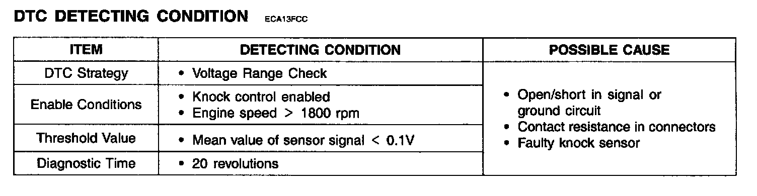 The ECM monitors the range of the analog input signal from knock sensor to check sensor failure that is short circuit or open circuit. It the difference between knock signal and noise level is smaller than the threshold during defined time period, the DTC P0325 is set. In case the noise level is higher than the upper threshold or lower than the lower threshold, the DTC P0330 is set too.