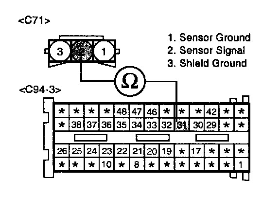 2. Measure resistance between terminals 2 of the sensor harness connector and 31 of the ECM harness connector.