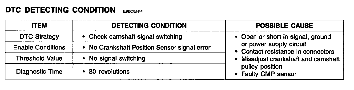 The ECM monitors the camshaft sensor signal transition position which must change only once per crankshaft revolution. If no camshaft signal is detected while crankshaft signal is detected, the ECM sets DTC P0340.