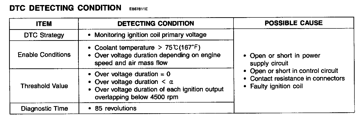 The ECM monitors the peak voltage duration of the ignition primary circuit. If abnormal signal is detected, the ECM sets DTC P0352.