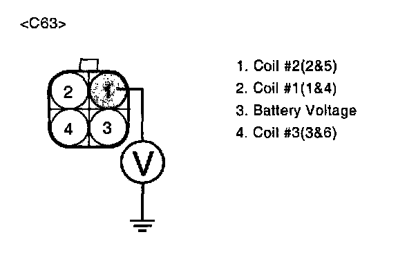 3. Measure voltage between terminal 1 of the coil harness connector and chassis ground.