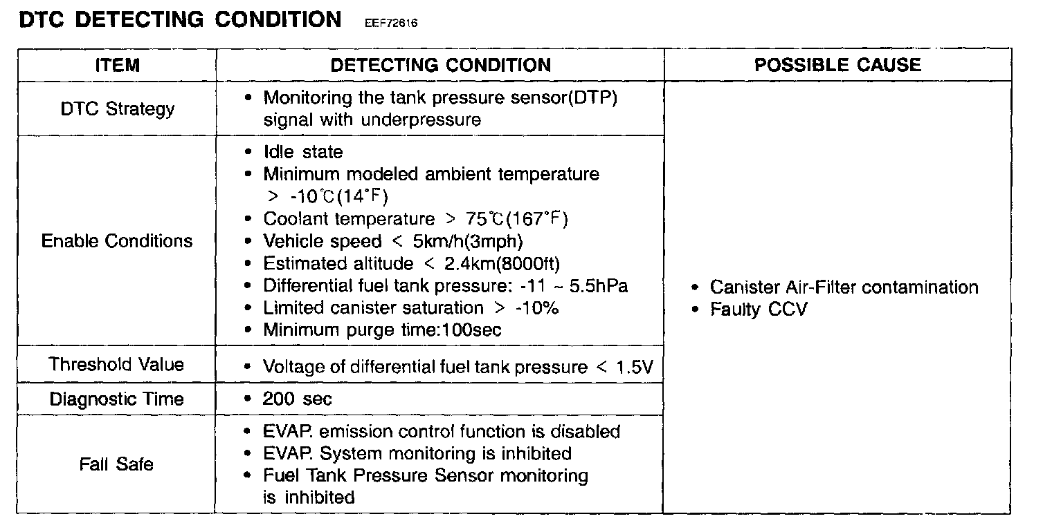 The ECM measures pressure in the fuel tank by means of tank pressure sensor during all engine operating states except engine stop and start. The DTC P0449 is set if pressure is lower than predetermined threshold.