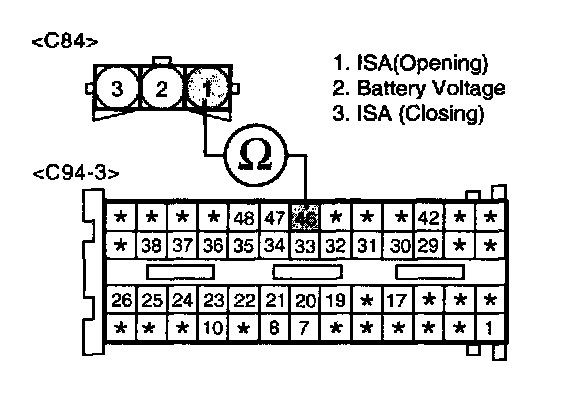 2. Measure resistance between terminals 1 of the ISA harness connector and 46 of the ECM harness connector.