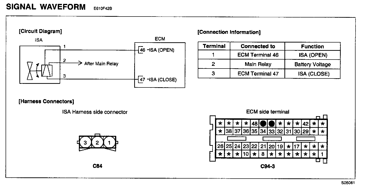 2. Measure resistance between terminals 3 of the ISA harness connector and 47 of the ECM harness connector.
