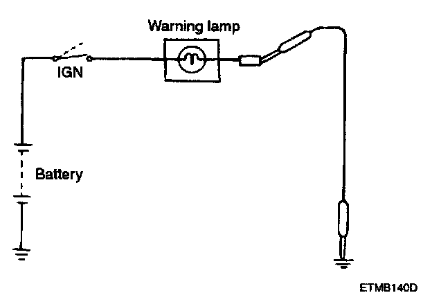 2. Turn the ignition switch ON. Check that the warning lamp lights up. If the warning lamp doesn't light, test the bulb or inspect wire harness.