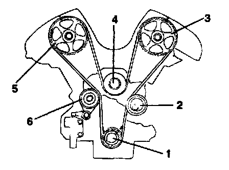 1.Crankshaft sprocket -> Idler pulley -> 3.Camshaft sprocket (LH side) -> 4.Water pump pulley -> 5.Camshaft sprocket (RH side) -> 6.Tensioner pulley.